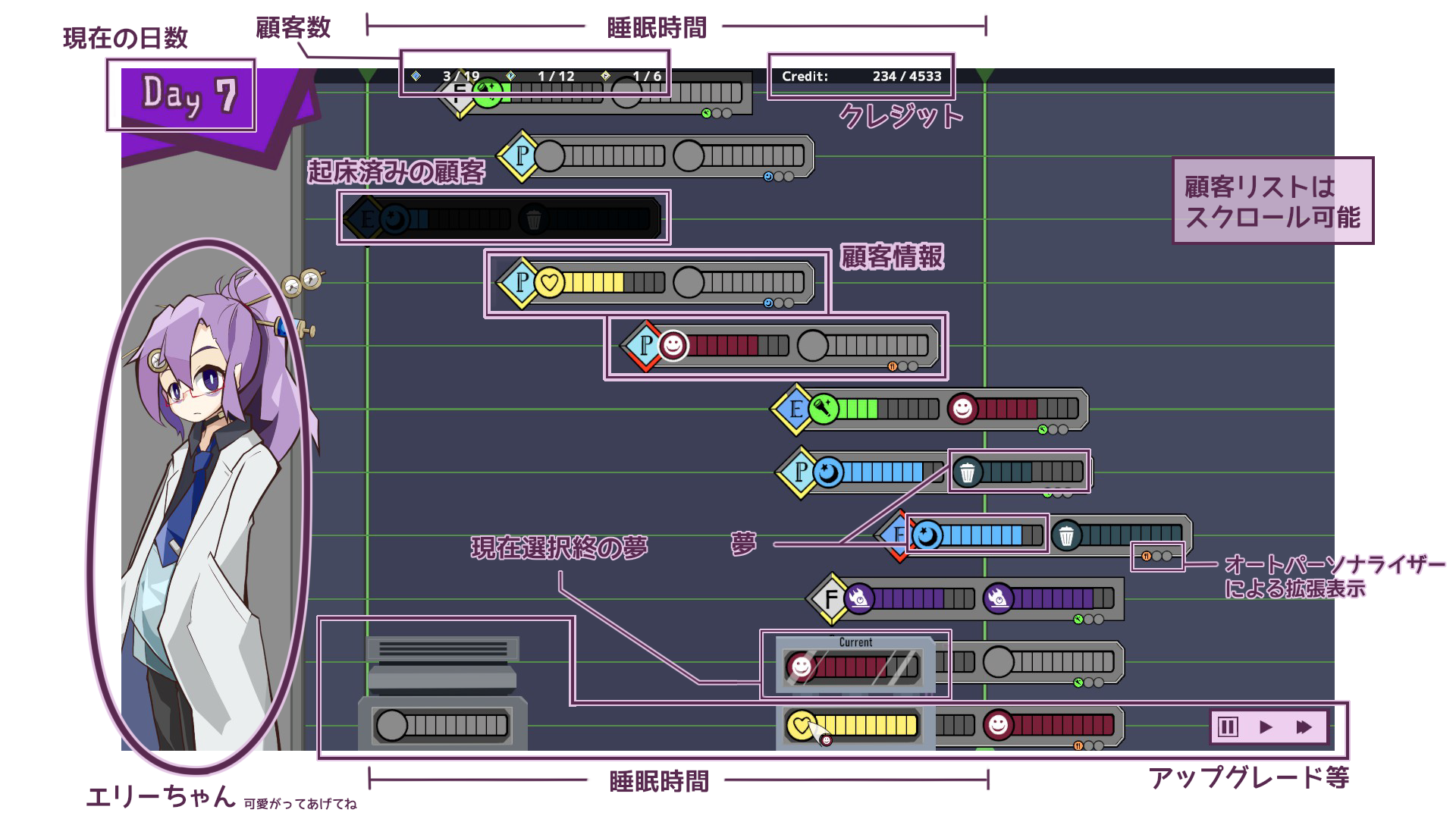 一時停止してじっくりと夢を管理したり、万全にしたら加速して時間を節約したりすることができます。
